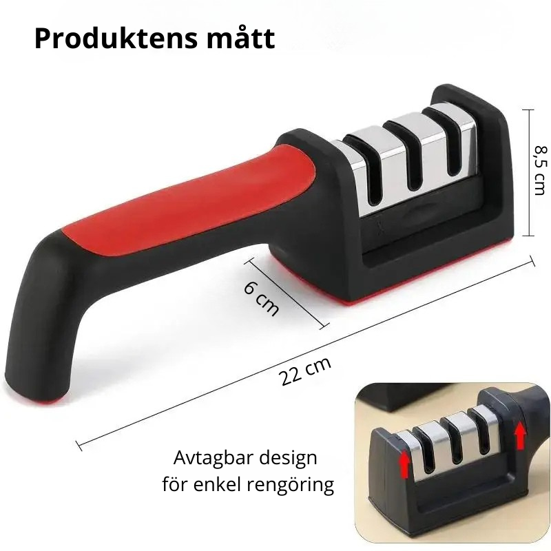 Knivslipen är utformad för att vara stabil och smidig att hantera, även i mindre kök. De tre slipstegen gör det enkelt att ta hand om både slöa och lätt slitna knivar, vilket förlänger livslängden på dina köksredskap.